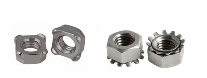 3. वेल्डेड नट: वेल्डेड नट्स को वर्गाकार और षट्कोणीय प्रकारों में विभाजित किया गया है। इन नटों के नीचे की ओर कई वेल्डिंग बिंदु होते हैं; स्थापना के बाद, उन्हें बहुत सुरक्षित बन्धन प्राप्त करने के लिए जगह पर वेल्ड किया जाता है।